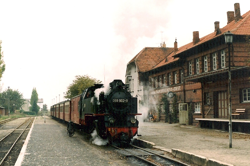 Von der Umzeichnung der Reichsbahnloks in das Bundesbahn-Nummernschema bis zum Übergang auf die Mecklenburgische Schmalspurbahn Molli GmbH, also von 1992 bis 1995, trug die 1932 gebaute 99 2322 die Nummer 099 902. Am 29.10.1993 stand sie im Bahnhof Ostseebad Kühlungsborn West bereit, ihre Garnitur aus Packwagen und sechs Personenwagen nach Bad Doberan zu bringen. |