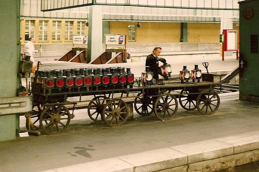 Als der Zugschluss bei Dunkelheit noch stets beleuchtet werden musste, waren bei der Deutschen Bundesbahn unzählige Petroleum-Zugschlusslaternen in Betrieb. In einem Kopfbahnhof, in dem ja alle Züge und Rangierfahrten zwangsläufig ihre Fahrtrichtung ändern, wurden die Laternen häufiger an- oder abgehängt als in anderen Bahnhofsformen. Auf einem der Zwischenbahnsteige des Stuttgarter Hauptbahnhofs stand am 18.06.1987 ein gewisser Vorrat von Laternen zum Einsatz bereit. Auf dem linken Karren befinden sich etwa vierzig davon! Ein fleißiger Eisenbahner war gerade mit der Pflege und Wartung einiger Laternen beschäftigt. |