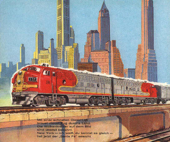 Als Vorbild für die Zeichnung diente dem Künstler hier eindeutig das Märklin-Modell der US-amerikanischenF 7-Diesellokomotive. Erkennbar ist dies an der Märklin-Hakenkupplung, die sich auf das Bild "hinübergerettet" hat.
