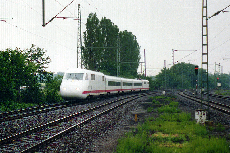 Der fünfteilige InterCity Experimental (ICE) wurde 1985 an die Deutsche Bundesbahn ausgeliefert. Diese führte ausgiebige Versuchsfahrten durch, ehe sie 1991 den Hochgeschwindigkeitsverkehr mit den serienmäßigen InterCity Express (ebenfalls "ICE")-Zügen aufnahm. Der Intercity Experimental, bestehend aus 410 001 + 810 001 + 810 002 + 810 003 + 410 002, war 1988 im Rahmen der Internationalen Verkehrsausstellung in Hamburg für Sonderfahrten zwischen Hamburg und Bremen eingesetzt. Am 03.06.1988 rauschte er auf der Fahrt nach Bremen durch den Bahnhof Hittfeld. |
