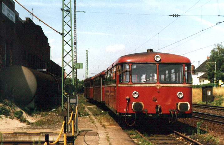 | Fast dreißig Einsatzjahre hatte der im September 1956 in Dienst gestellte 798 622 bereits hinter sich, als er am 30.07.1986 zusammen mit 998 150 und 798 644 auf einem Abstellgleis im Bahnbetriebswerk Heidelberg stand. Irgendwann in diesen vielen Jahren unermüdlichen Einsatzes hatte er sich eine leichte Delle in der Front zugezogen. |