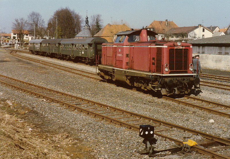 Die beiden Zugpaare, die in den letzten Jahren bis zur 1993 erfolgten Stilllegung der Strecke zwischen Kulmbach und Thurnau verkehrten, waren zeitlich auf den Hauptteil des Schülerverkehrs ausgerichtet. Es war die Zeit zwischen 13:50 Uhr und 14:02 Uhr, die 211 296 am 18.03.1986 nutzte, um im Bahnhof Thurnau an das andere Ende der Garnitur aus drei Byg-Wagen umzusetzen. Als N 8813 war das Gespann von Kulmbach gekommen und sollte als N 8814 dorthin zurückfahren.