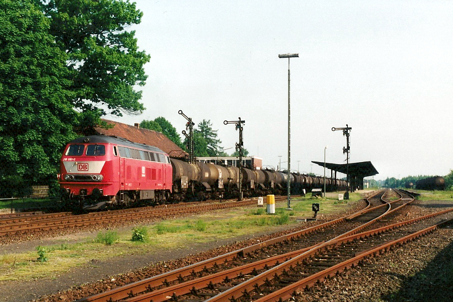 Mit einem Kesselwagenzug in Richtung Diepholz war 216 081 am 18.05.1994 bei der Ausfahrt aus dem Die Lokomotive war zuvor als Lz hierhergekommen. Die Zugschlusstafel steckte noch immer - nunmehr an der Spitze des Zuges. |