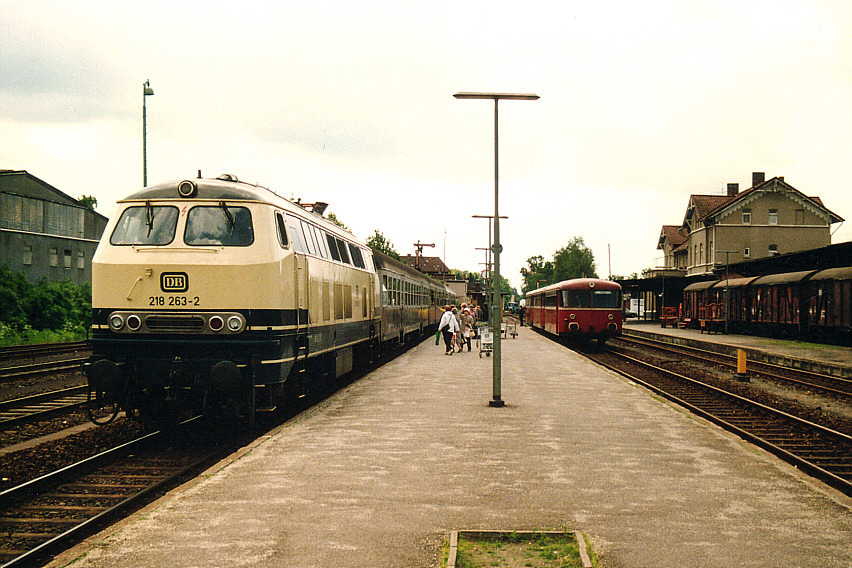 Es war um die Mittagszeit des 09.06.1987. Mit einer etwa zwanzigminütigen Verspätung brachte 218 263 den E 6308 Hannover – Soltau in den Bahnhof Walsrode, um gleich darauf die Weiterfahrt anzutreten. Der glänzende Lack und die noch wirklich weißen Kanten der Trittstufen lassen vermuten, dass die letzte Hauptuntersuchung noch nicht lange her war.