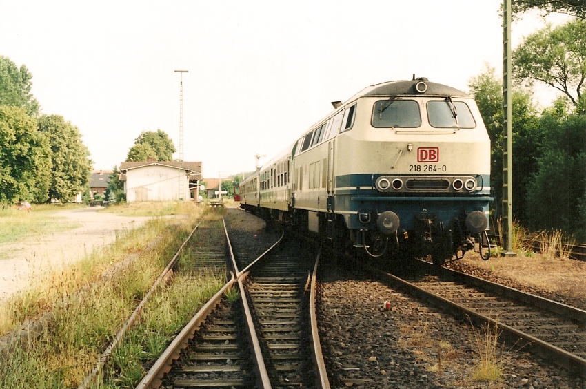 | RB 6609 Uelzen - Braunschweig wurde am 15.07.1995 von 218 264 gezogen. Ein Halbgepäckwagen der ehemaligen Deutschen Reichsbahn und zwei einstige D-Zug-Wagen der ehemaligen Deutschen Bundesbahn bildeten die Garnitur. Im Bf. Wahrenholz wurde der Gegenzug RB 6612 abgewartet. |
