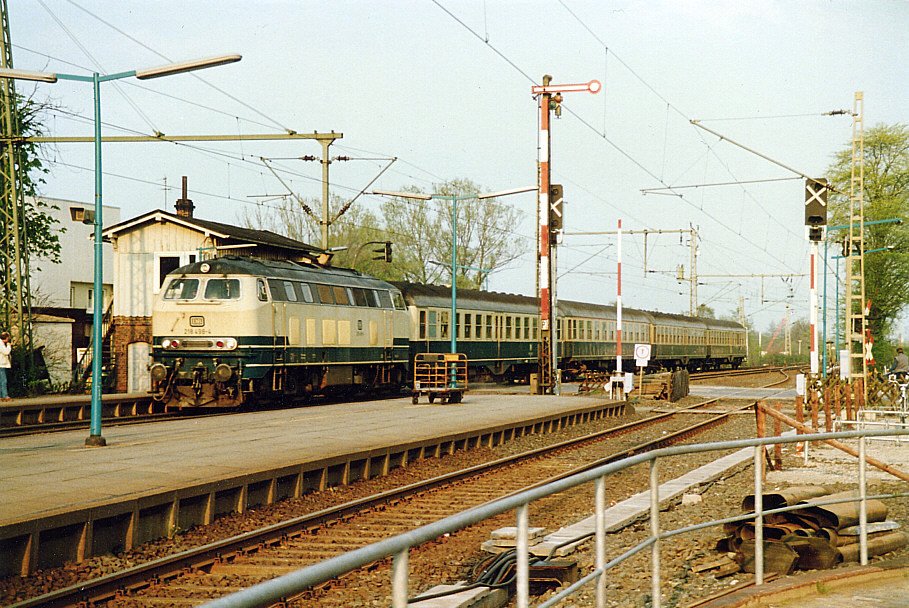 Mit einem Eilzug Hamburg – Cuxhaven war 218 498 im Abendlicht des 02.05.1987 unterwegs. Bei der Einfahrt in den Bahnhof Buxtehude passierte der Zug das hinter der Lok hervorschauende alte Stellwerk, dessen letzte Tage bereits eingeläutet waren. (Siehe die bereits aufgestellten, aber noch nicht in Betrieb genommenen Lichtsignale.) Aber auch der Bahnübergang ist mittlerweile durch eine Unterführung der Straße ersetzt worden.
