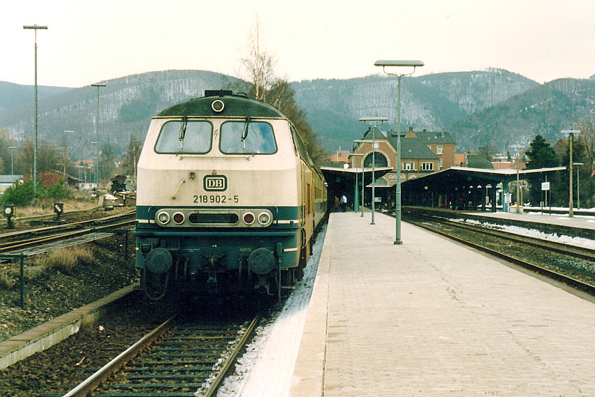 218 902, einer der ehemaligen Gasturbinenloks, kam am 07.02.1987 die Aufgabe zu, Eilzug E 3138 Bad Harzburg - Norddeich Mole zu bespannen. So stand sie also an jenem Tag im Bahnhof Bad Harzburg bereit, die Fahrt zu beginnen. |