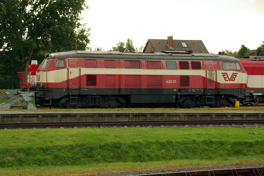 Die Eisenbahnen und Verkehrsbetriebe Elbe-Weser (EVB) nutzten so manche ehemalige Bundesbahn-Lokomotive für ihre vielfältigen Einsätze im Güterverkehr. Hinter 420 01 verbirgt sich die ehemalige Gasturbinenlok 219 001, bei der Deutschen Bundesbahn 1965 versuchsweise in Dienst gestellt als V 169 001. Sie wurde 1974 durch Entfernung der Gasturbine zur "normalen" Diesellok umgerüstet, 1977 ausgemustert. Am 04.10.2009 stand die Lok im Betriebswerk Bremervörde der EVB, wo früher der Bahnhof Bremervörde Süd war.) |