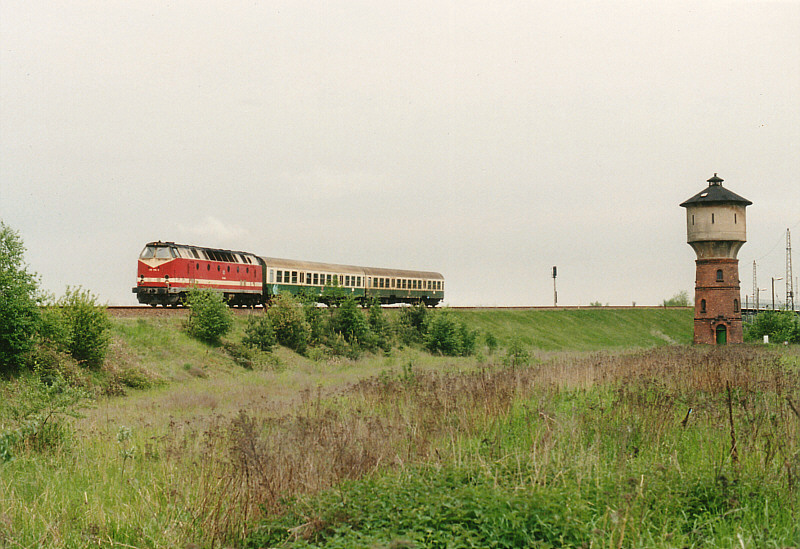 Am 01.06.1996, dem letzten Betriebstag der in Mecklenburg gelegenen Strecke Wismar - Karow, war 219 018 als Zuglok der RB 7611 Wismar - Borkow unterwegs. Nachdem der Zug die Hauptstrecke von Bad Kleinen (erkennbar an den Oberleitungsmasten rechts nebem dem Wasserturm) überquert hatte, fuhr er in den Bahnhof Blankenberg ein.