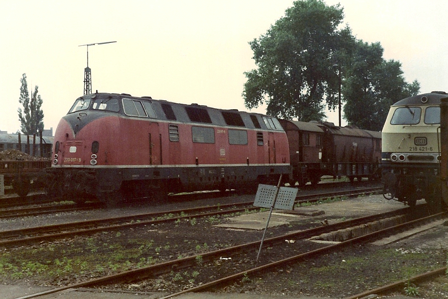 Die 1957 in Dienst gestellte 220 017 war von der Deutschen Bundesbahn zum 31.03.1983 ausgemustert worden . Zuletzt war sie im Bw Lübeck stationiert gewesen. Am 06.07.1984 stand sie im Ihre Zukunft war 1986 die Aufarbeitung durch die Regentalbahn AG und darauf folgend der Einsatz als Hinter der 220 stand die fahrbare Tankanlage, die 1944 für die Luftwaffe gebaut worden war und später der Bundesbahn als Provisorium diente, wo eine ortsfeste Tankanlage nicht vorhanden oder vorübergehend nicht nutzbar war. |