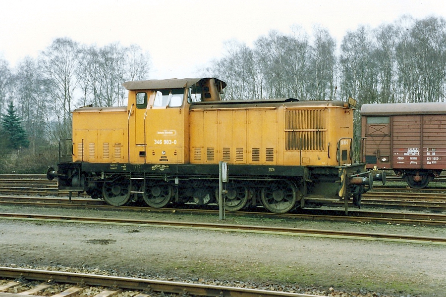 Die Umnumerierung der Reichsbahn-Lokomotiven nach dem Bundesbahn-Nummernschema war gerade vollzogen. Hinter 346 983 der DR verbirgt sich die ehemalige 106 983. Im Bahnhof Hagenow Land wartete sie am 22.02.1992 auf weitere Rangieraufgaben. |