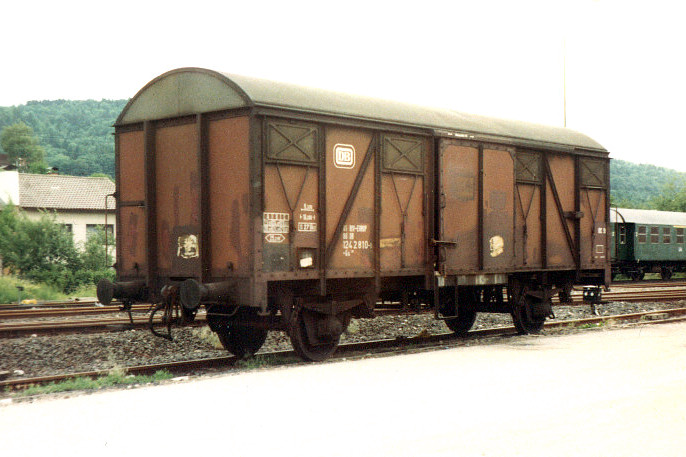 Hierbei handelt es sich um ein Exemplar der letzten von der Deutschen Bundesbahn entwickelten und ab 1966 gebauten zweiachsigen gedeckten Güterwagenbaureihe. Dieser Wagen stand an einem Tag im Juni 1982 im Bf. Ebermannstadt. |